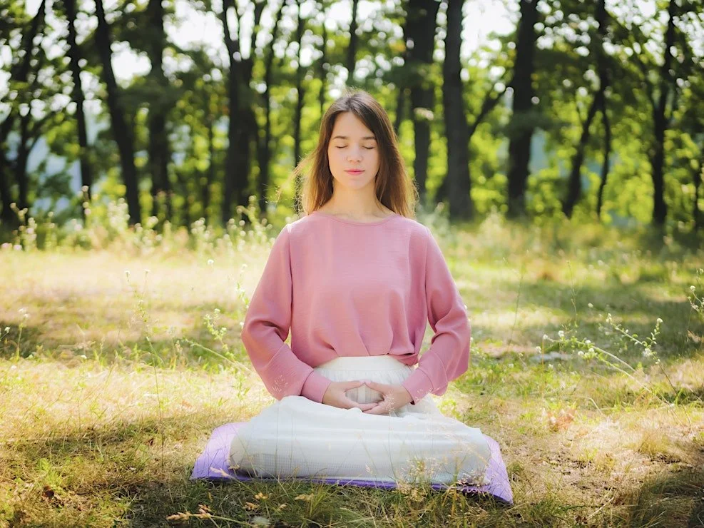 A woman practices the 5th Falun Dafa exercise, a sitting meditation.